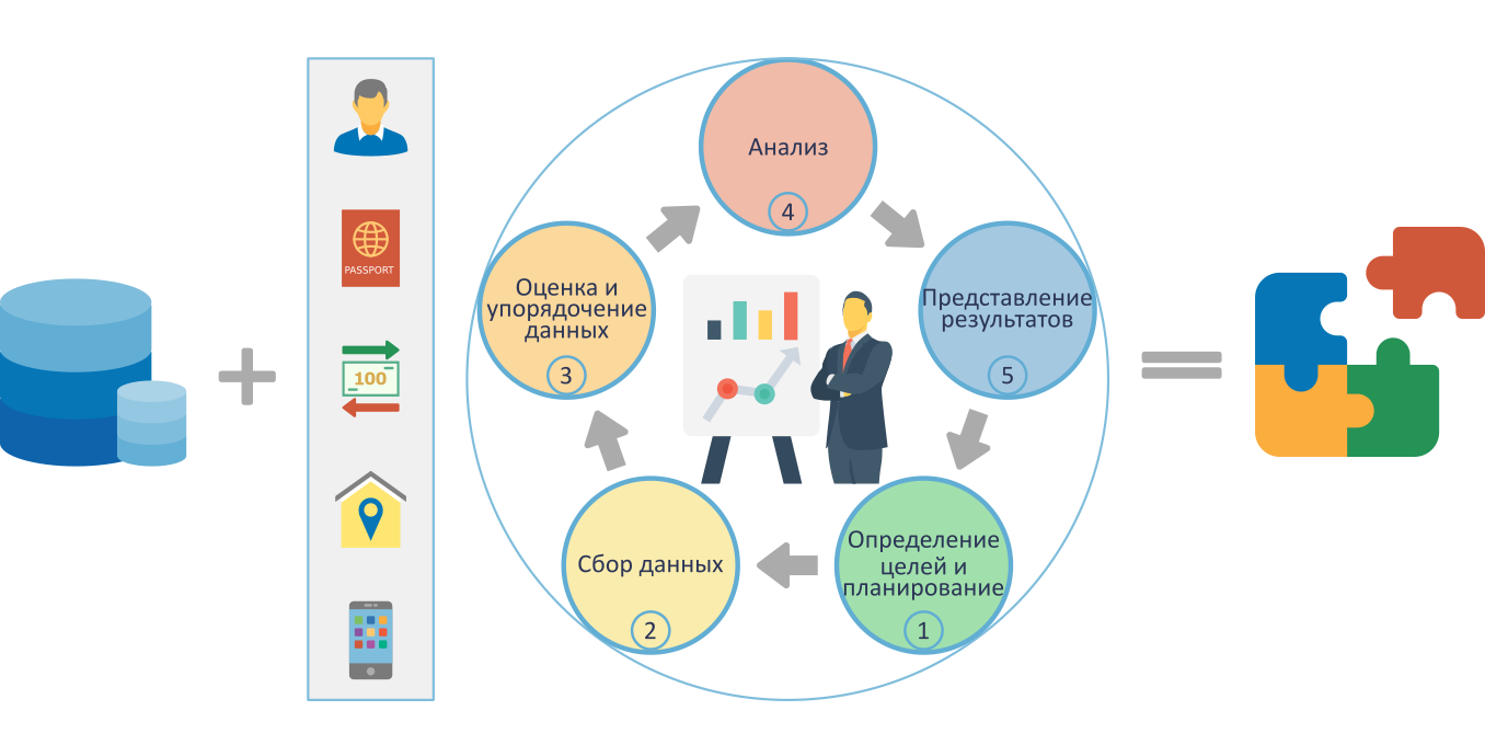 Определение целей и планирование → Сбор информации → Проверка и оценка информации → Упорядочение и систематизация → Анализ информации → Представление результатов для принятия решений.