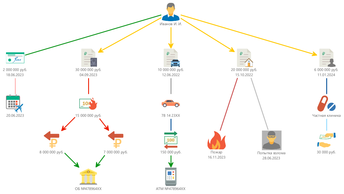 - Выявлять скрытые отношения — обнаруживать связи между страхователями, совершающими действия с признаками мошенничества, а также объединяющими их организациями.
